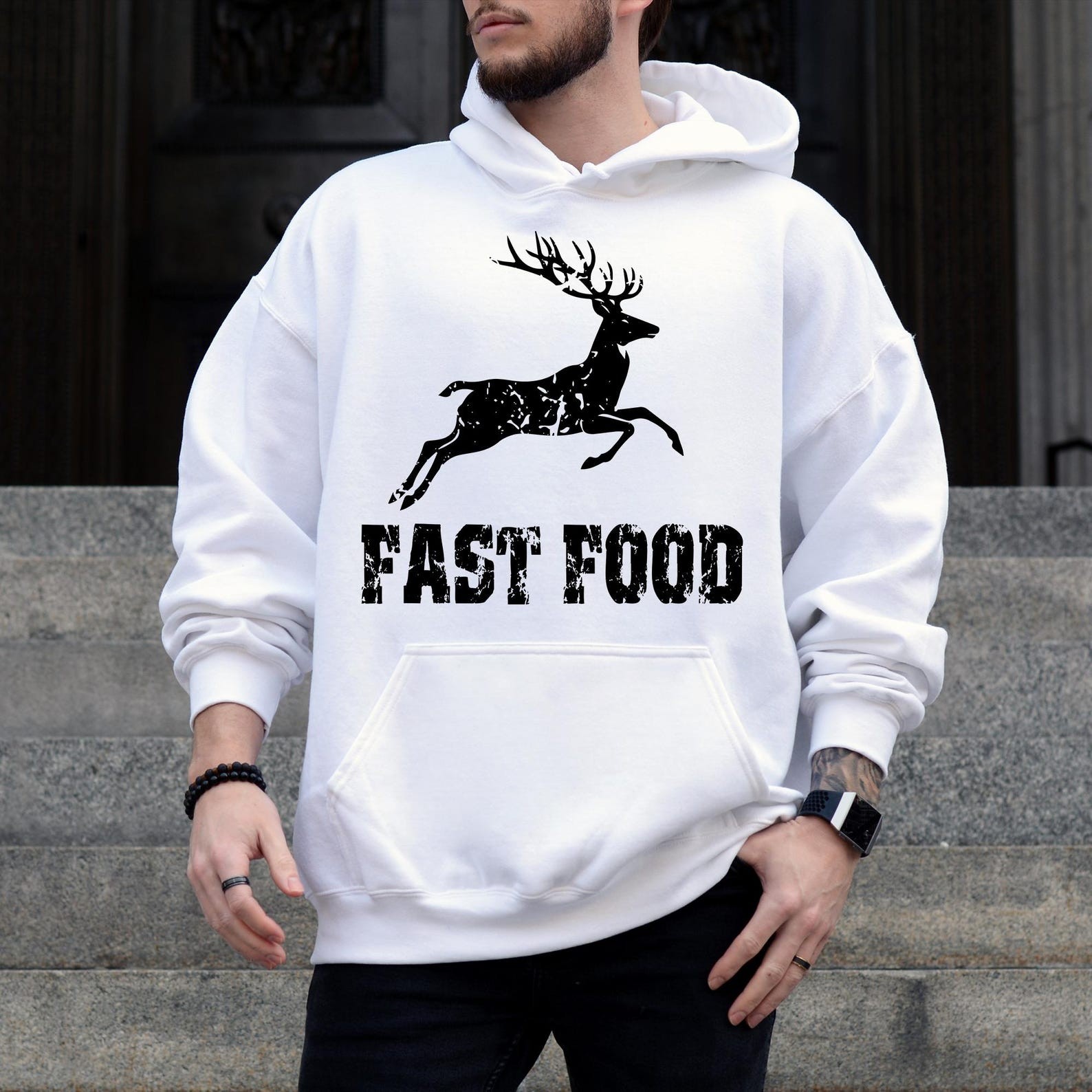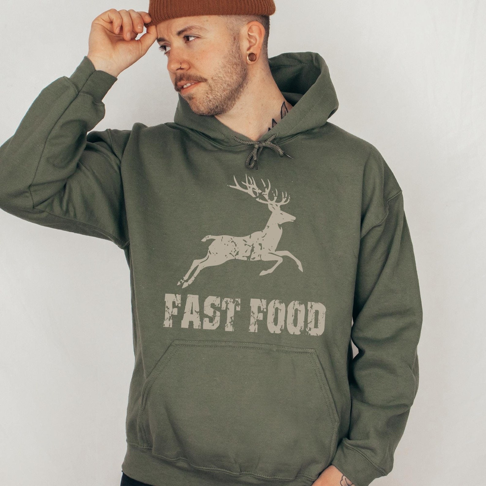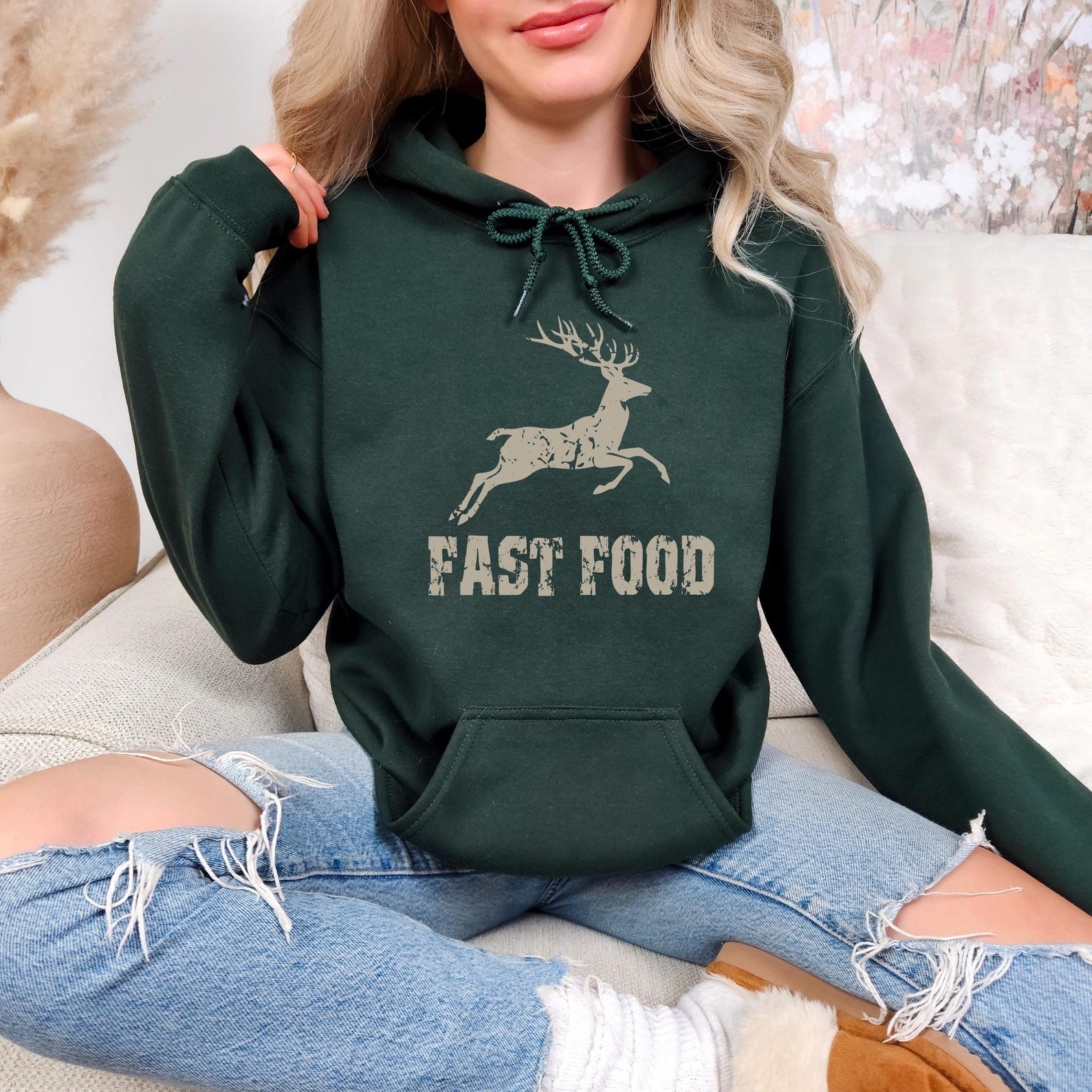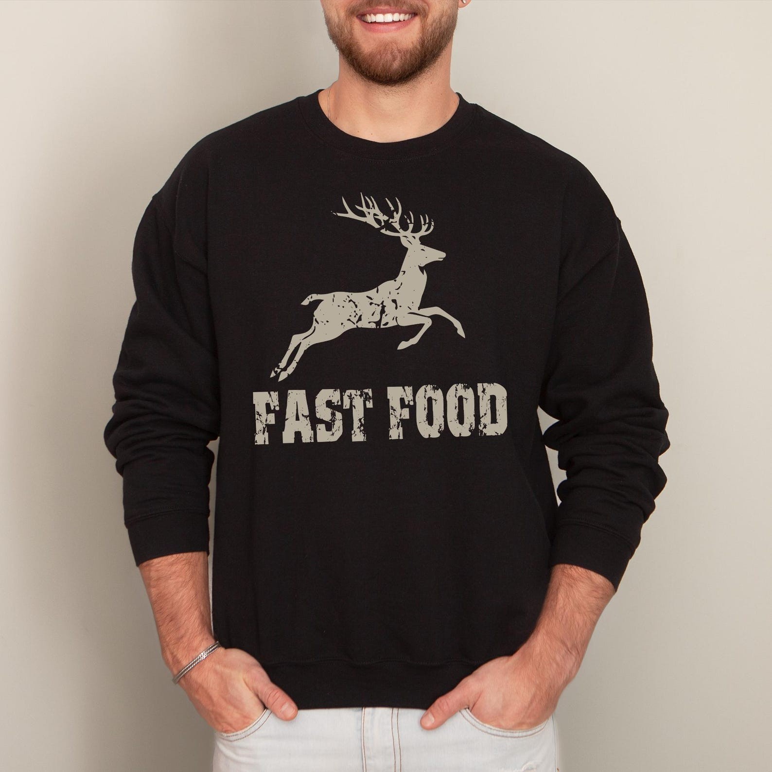 ast Food Deer Hoodie, Funny Joke Hunting Hoodie, Hunting Men Hoodie, Dad Hunter Gift, Deer Hoodie, Rude Offensive Gifts For Hunters Our youth hoodies are designed with safety in mind. To eliminate the risk of suffocation, they do not feature drawstrings. PRODUCT DETAILS Indulge in our meticulously crafted sweatshirts and hoodies, where every detail is carefully considered and double-needle stitching ensures lasting durability. Embrace the cozy, unisex design, expertly crafted from a blend of 50% cotton and 50% polyester for the ultimate comfort experience. CARE INSTRUCTIONS Maintain the pristine condition of your garment with ease: - Machine wash inside out on a delicate cycle with low temperature. - Tumble dry on low heat for optimal results. - Avoid bleach, dry cleaning, and ironing directly on the design to preserve its integrity.