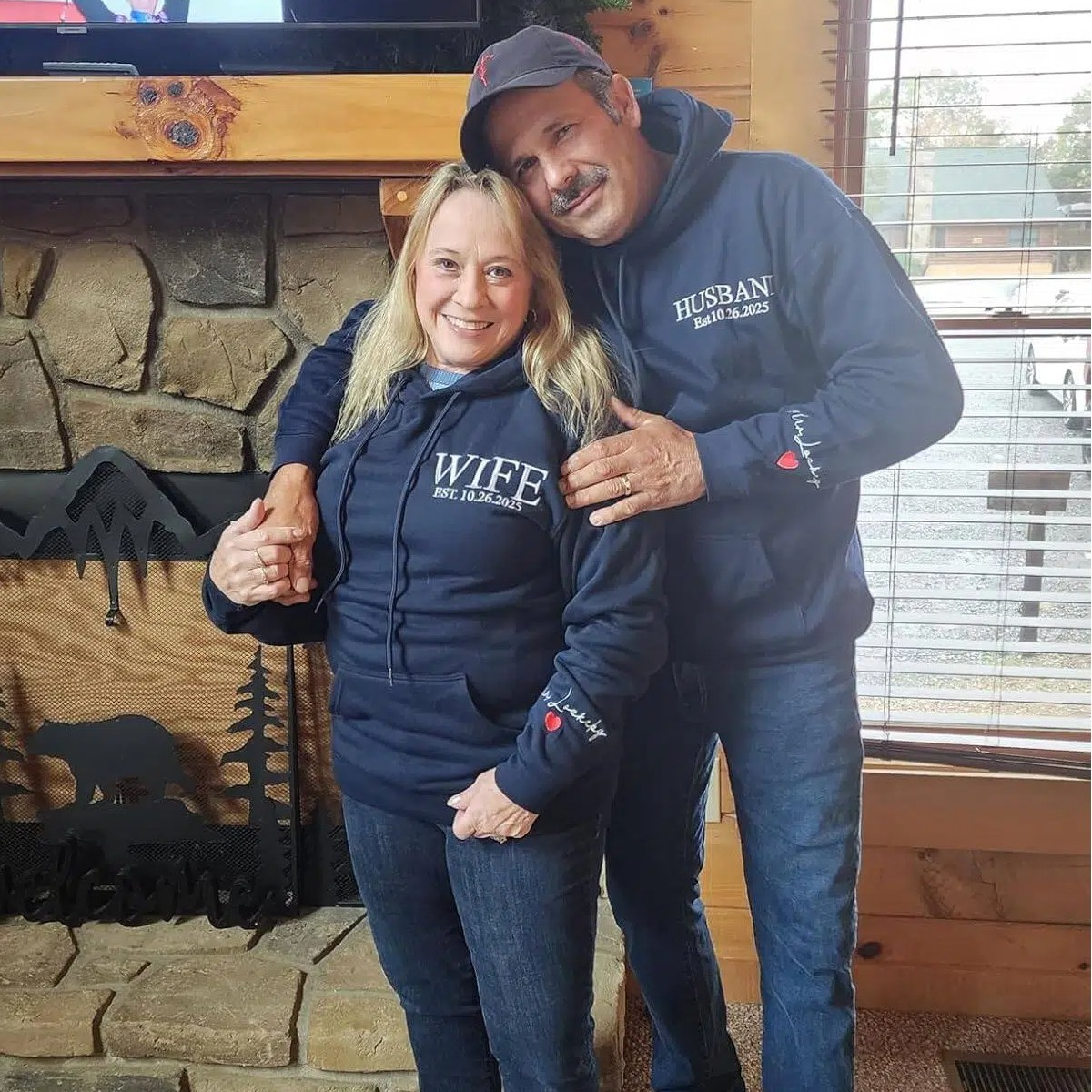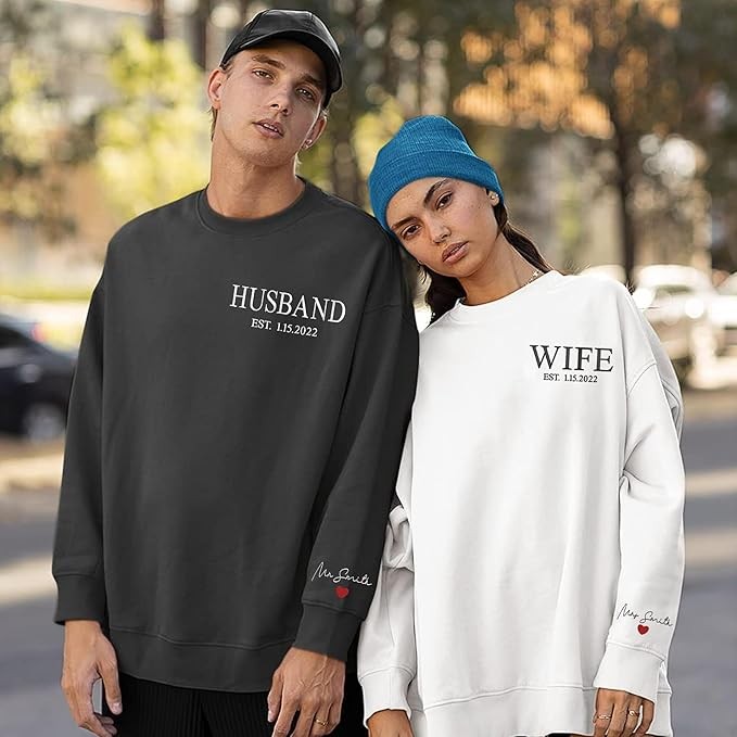 Custom Embroidered Wife & Husband Sweatshirt Hoodies, Personalized Couple Names On Sleeve With Heart, Custom Anniversary Date, Gifts For Couples, Gifts For Wife, Husband, Bride Sweatshirt