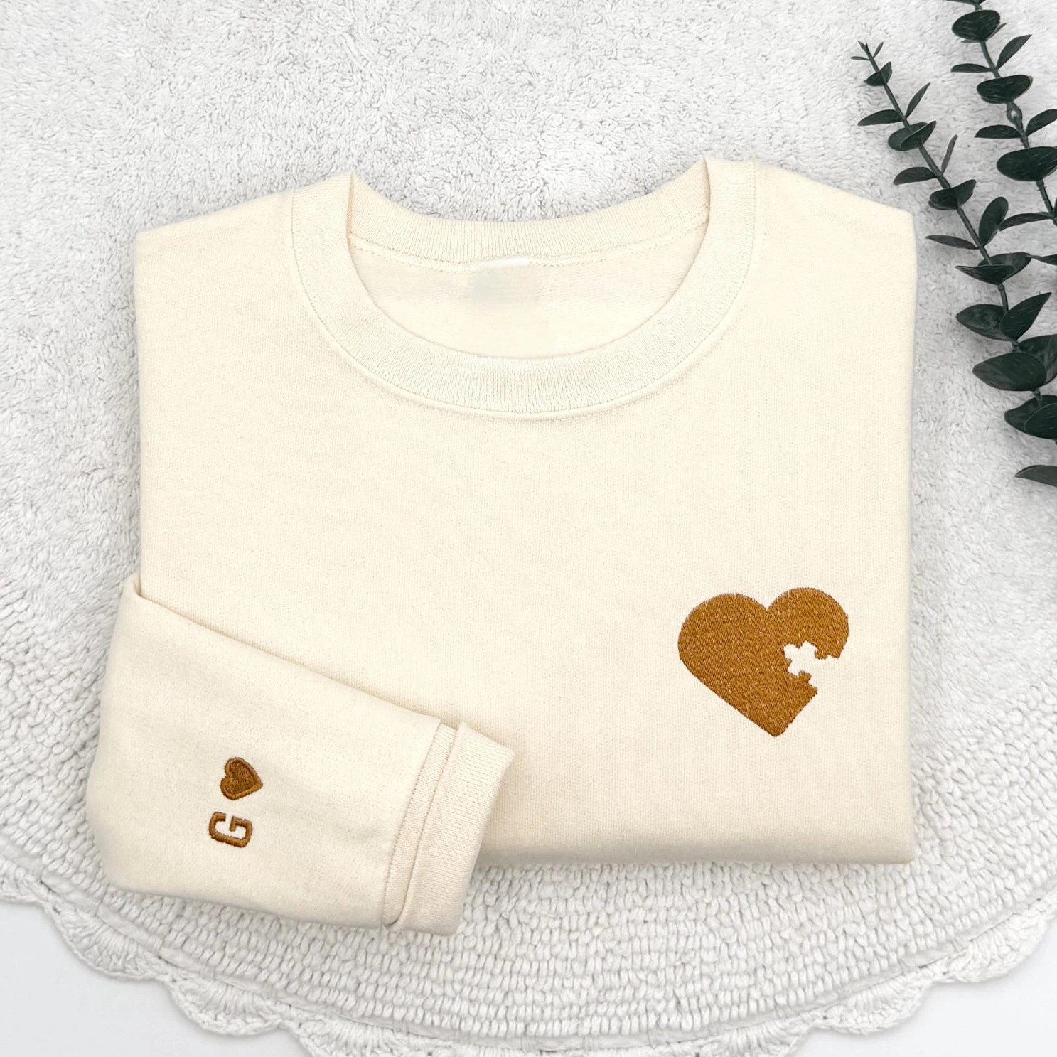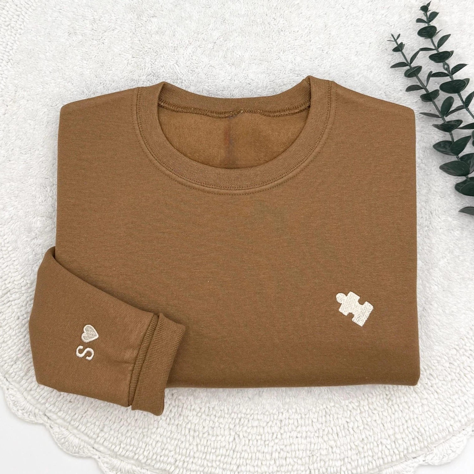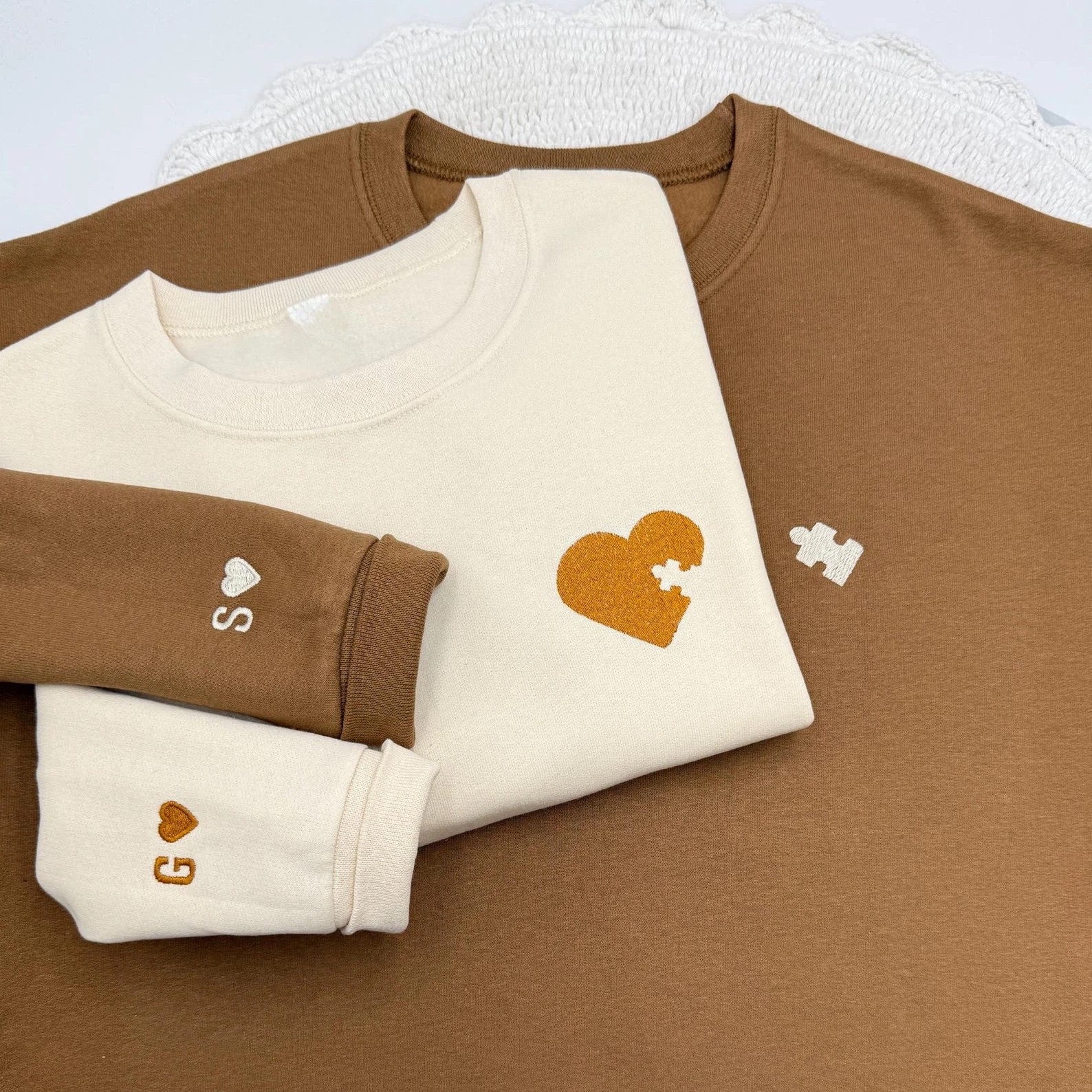Embroidered Couples Sweatshirt, Puzzle Heart, Initials Sleeve, Anniversary Gift