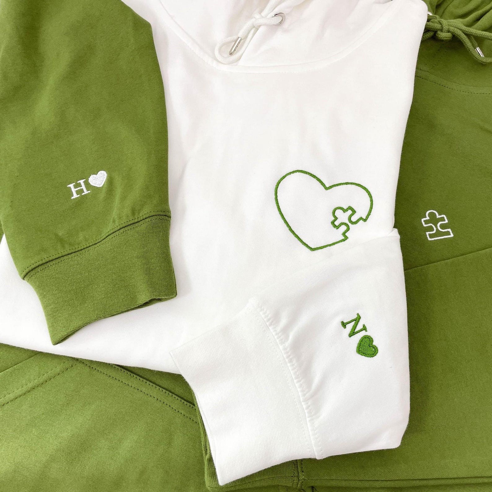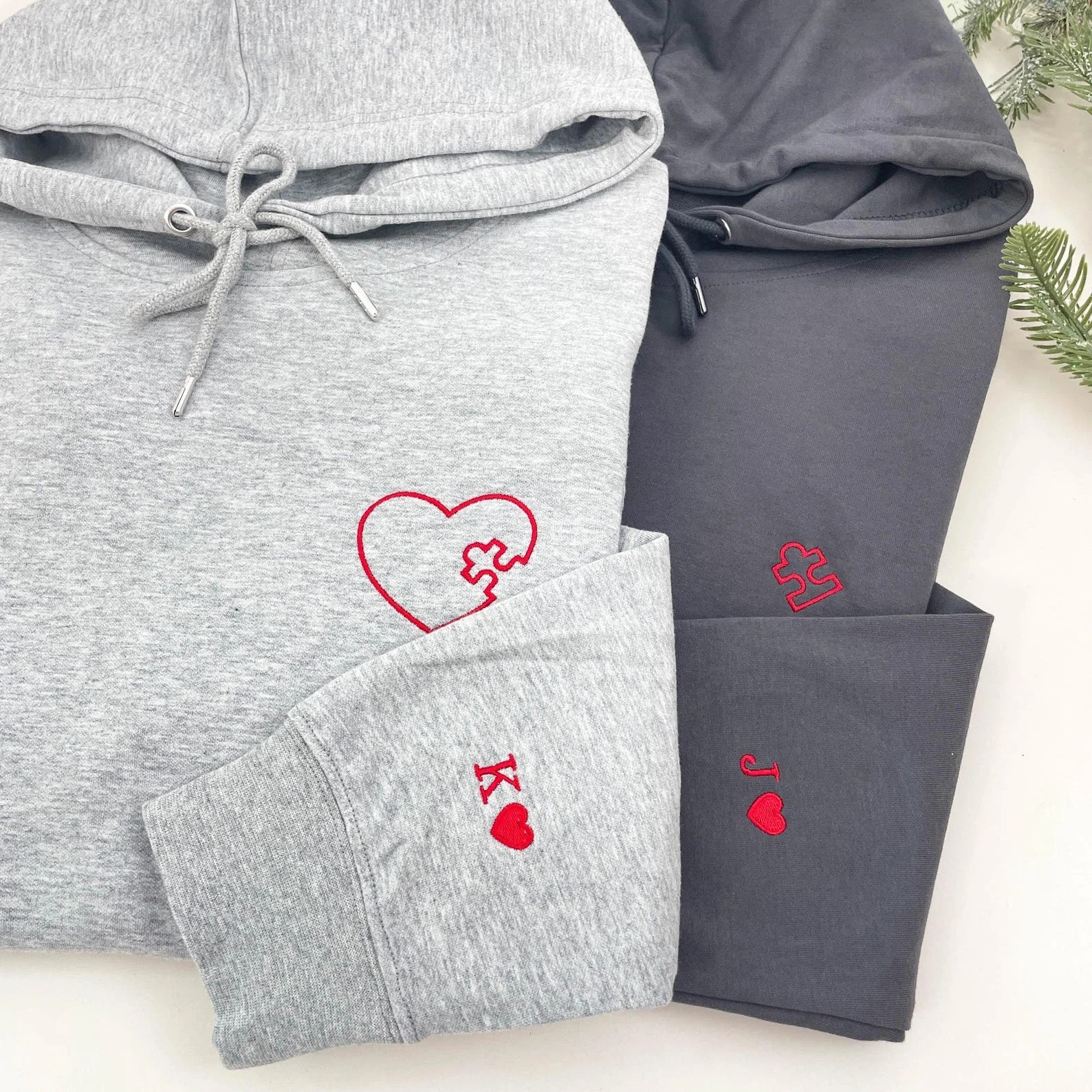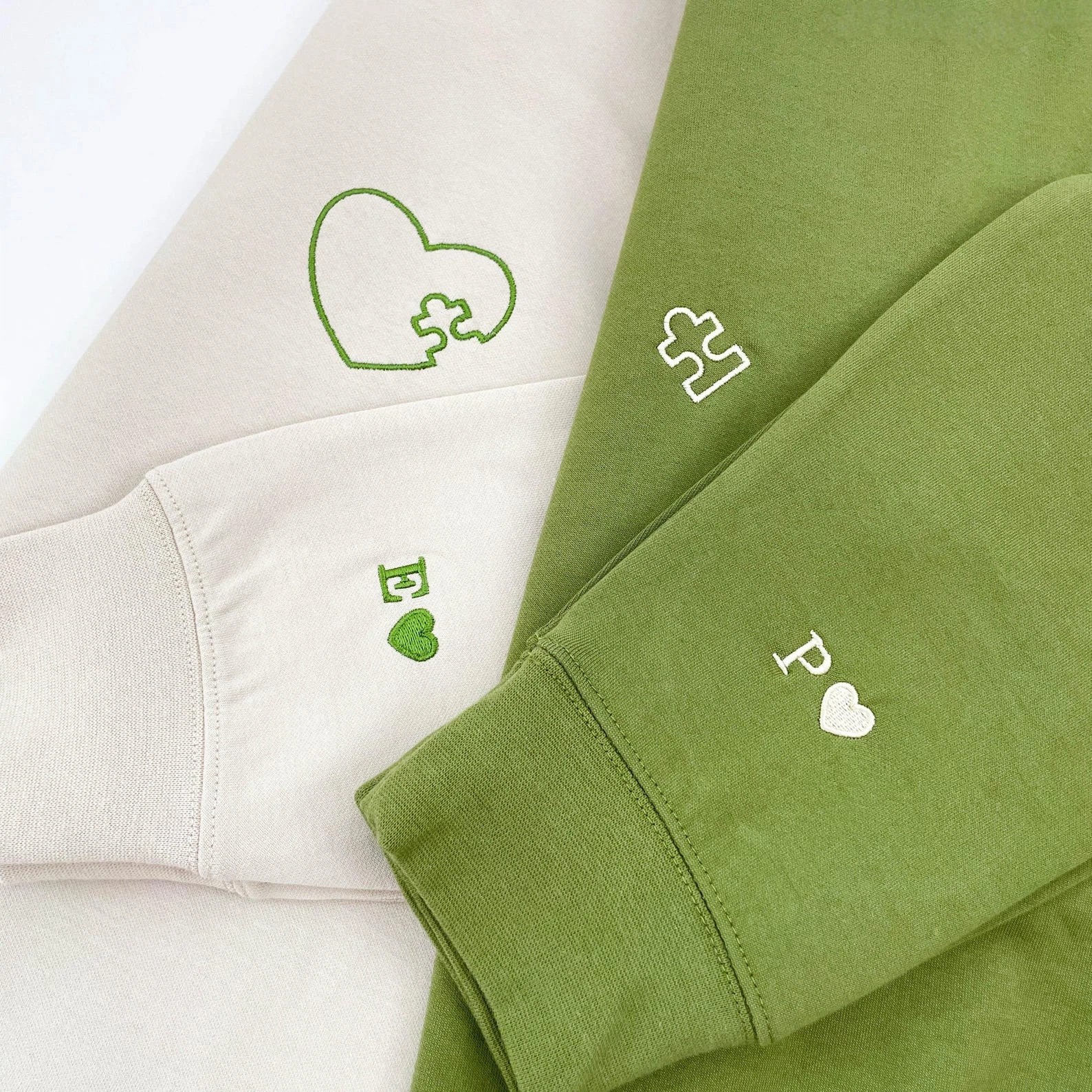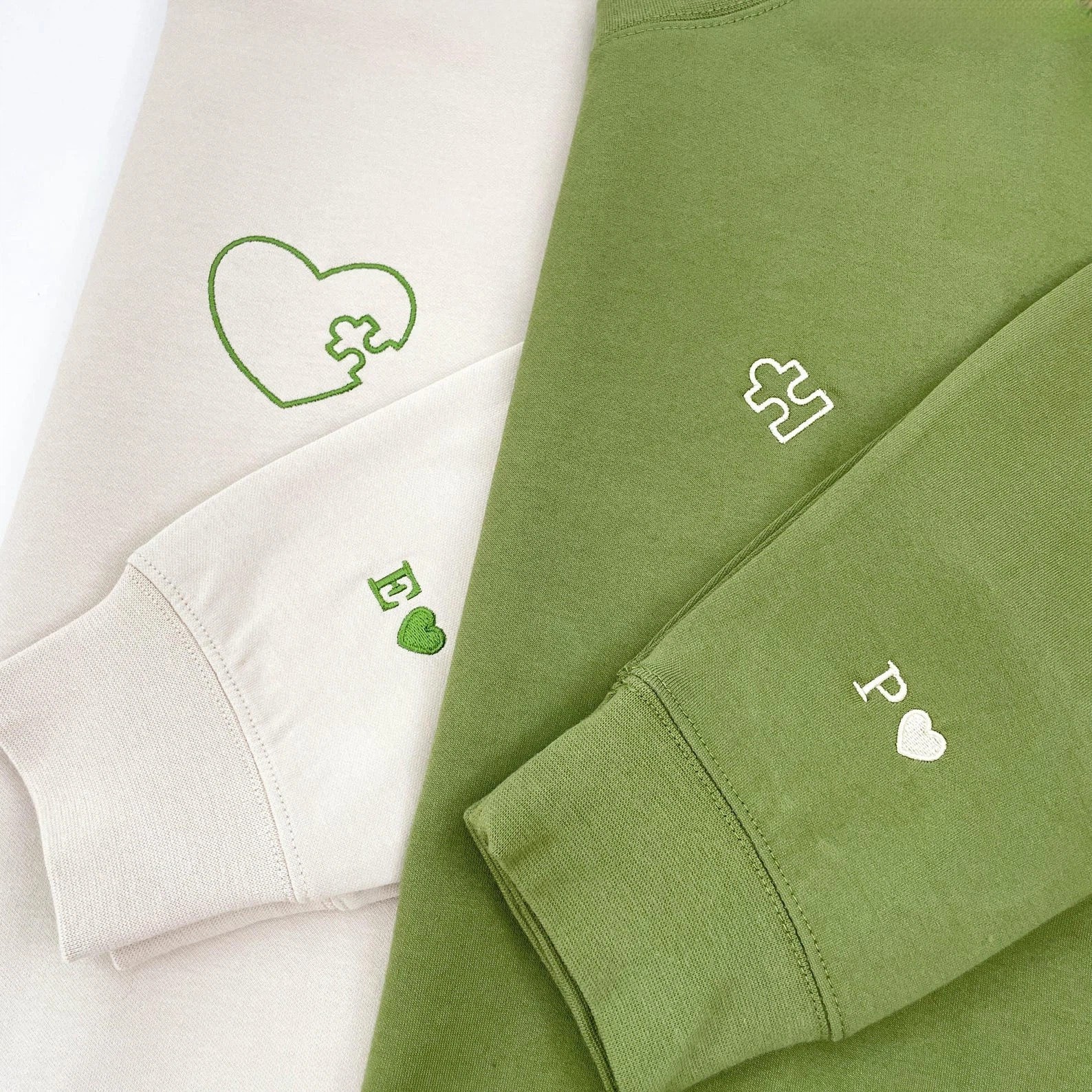 Embroidered Heart and Puzzle Piece Matching Couple Sweatshirt | Initial with Heart On Sleeve | 1st Anniversary Gift | Valentine Gift for Him
