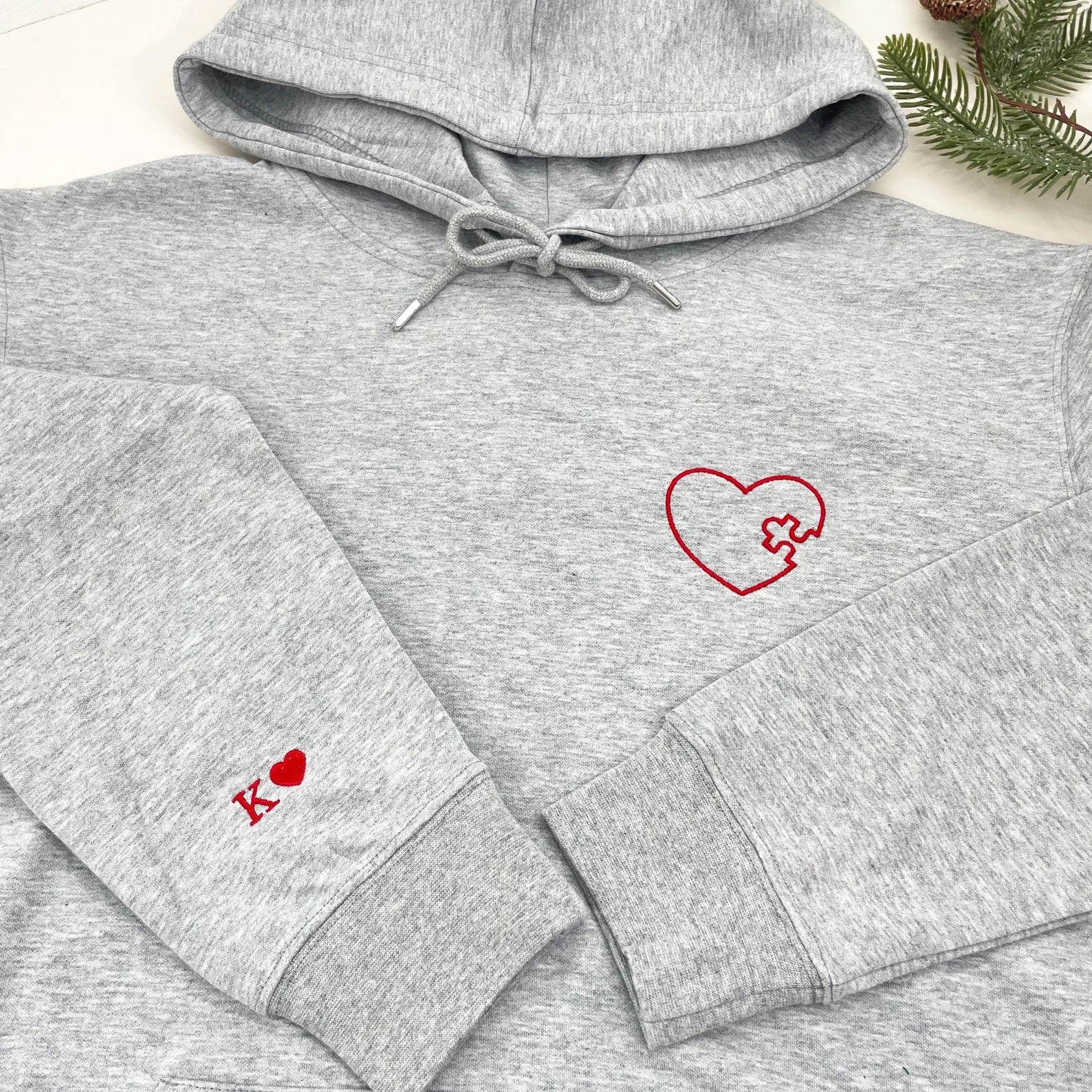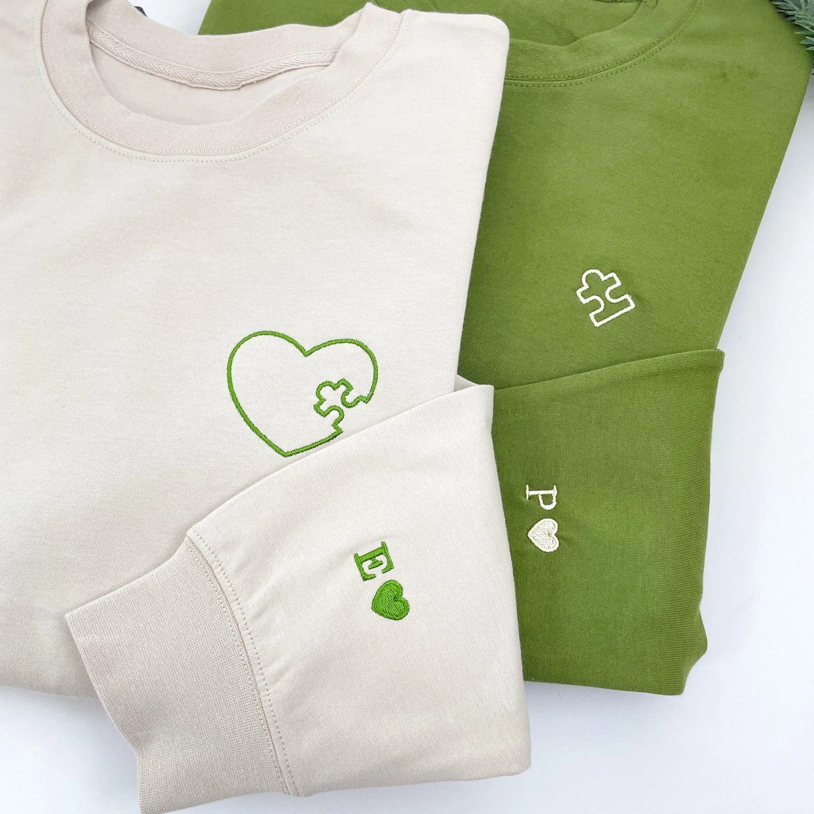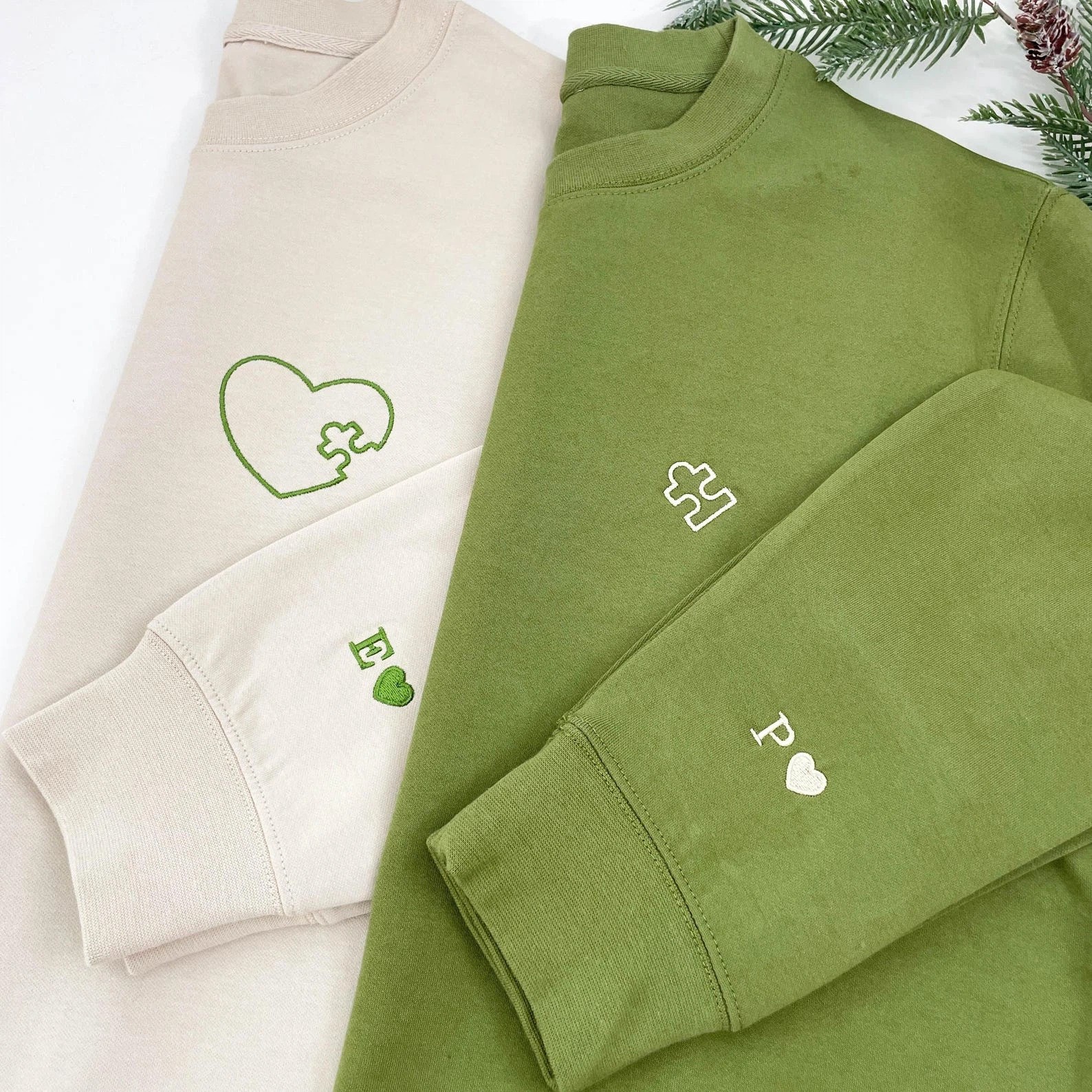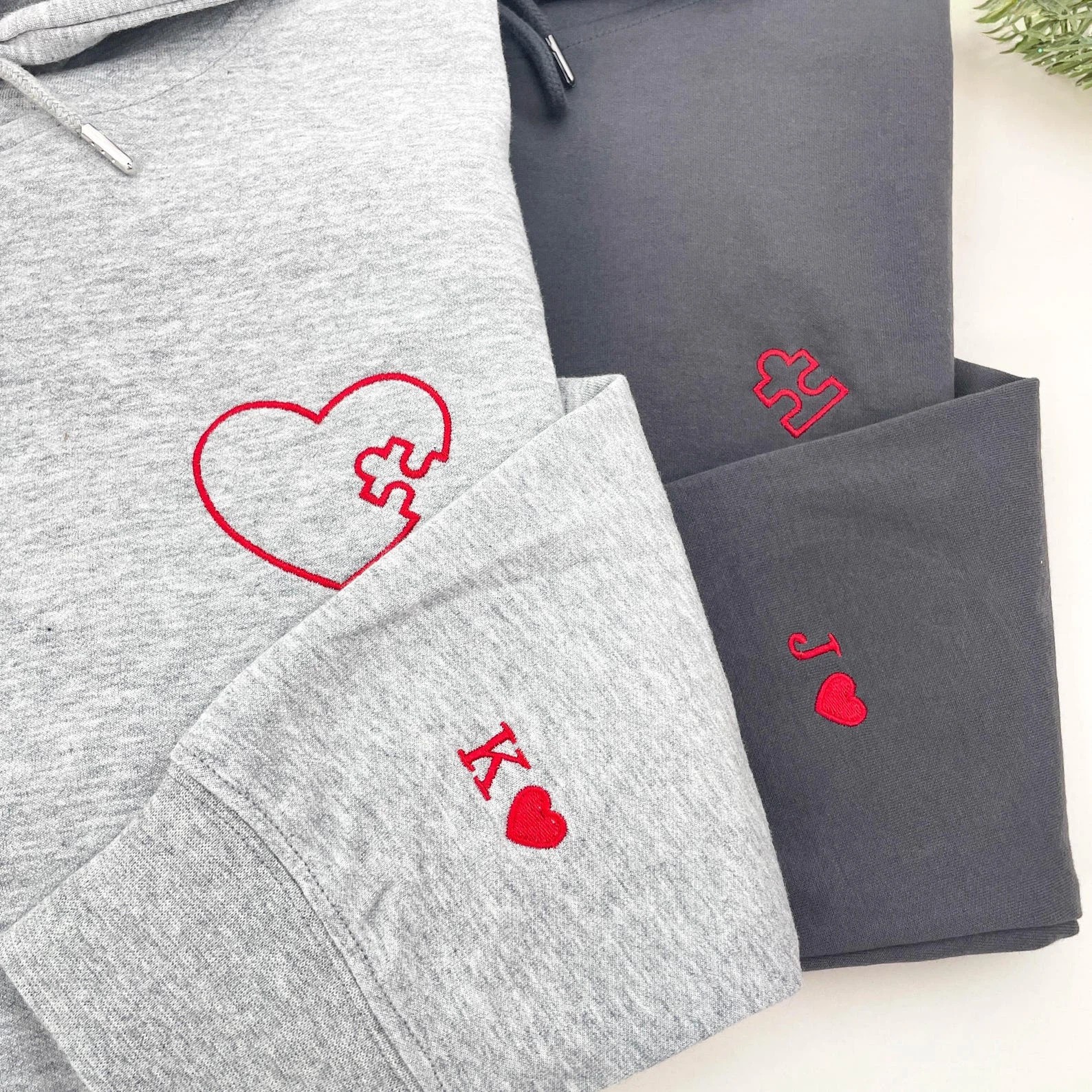 Embroidered Heart and Puzzle Piece Matching Couple Sweatshirt | Initial with Heart On Sleeve | 1st Anniversary Gift | Valentine Gift for Him