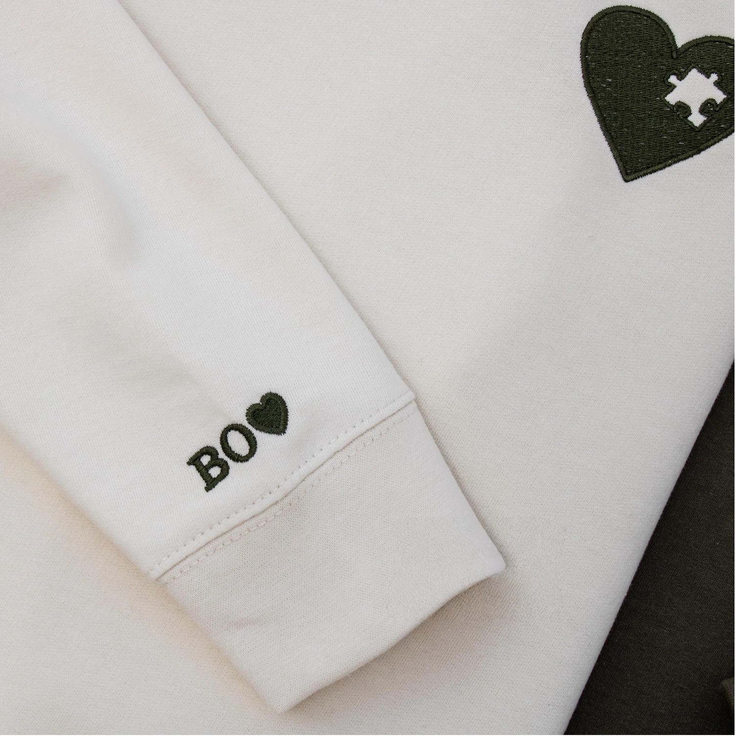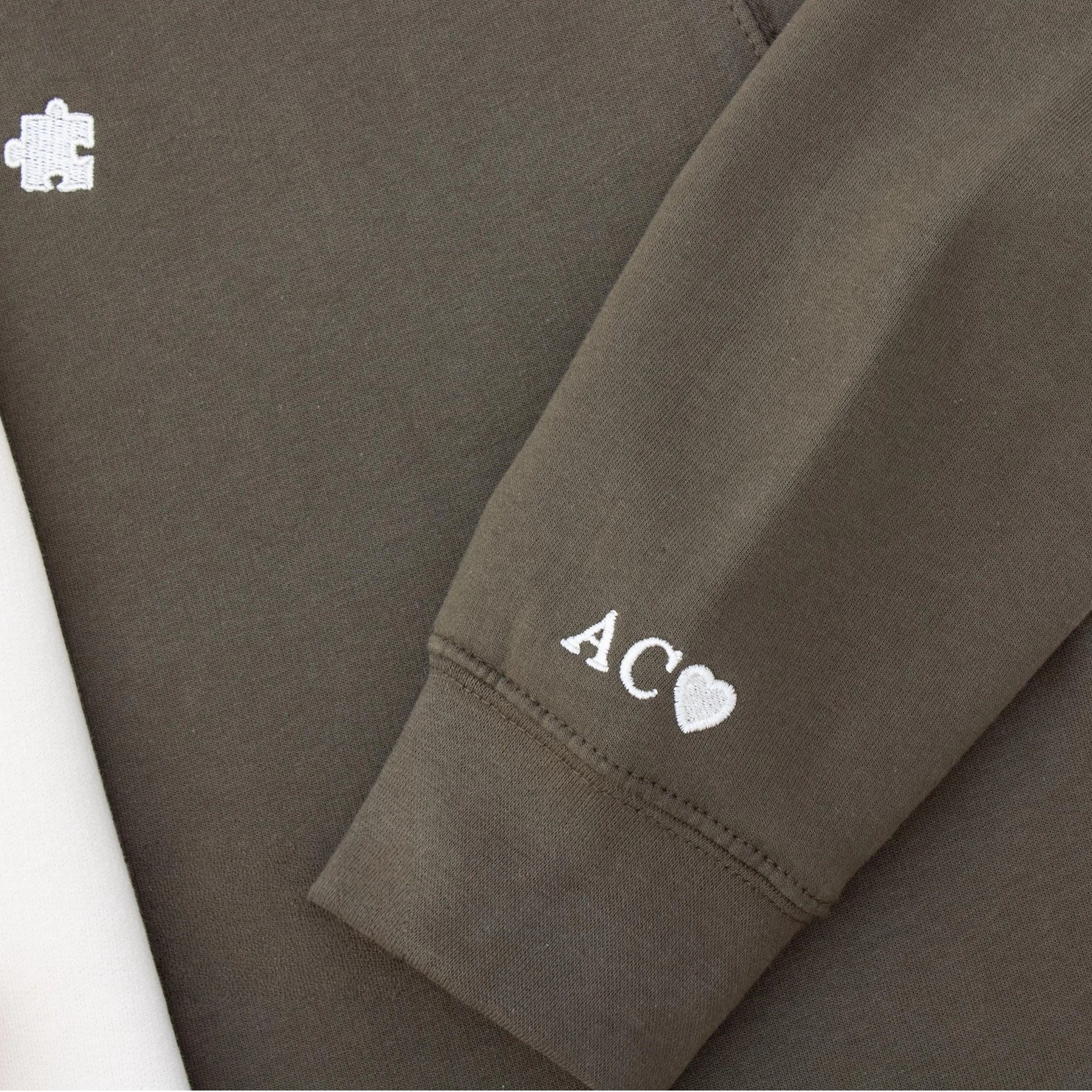 Embroidered Heart and Puzzle Piece Sweatshirt with Initials on Sleeve Anniversary Gift Custom Couple Hoodie Valentines Day Anniversary Gift